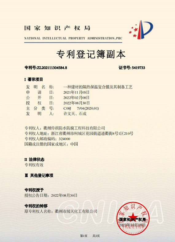 衢州傳祺新材料科技有限公司是衢州市聞天化工有限公司的下屬企業(yè);衢州市聞天化工有限公司成立于2003年,是國(guó)內(nèi)最早研發(fā)、生產(chǎn)氟碳涂料的企業(yè)之一。衢州傳祺新材料科技有限公司成立于2017年,公司專(zhuān)注于高分子氟材料的開(kāi)發(fā)和含氟材料在防腐、防水領(lǐng)域的應(yīng)用。經(jīng)過(guò)6年的不懈努力,已獲得了化工和建筑領(lǐng)域六項(xiàng)國(guó)家發(fā)明專(zhuān)利授權(quán)和兩項(xiàng)新產(chǎn)品科技成果獎(jiǎng),參與了中國(guó)建筑材料流通協(xié)會(huì)《房屋修繕?lè)浪こ桃?guī)范》標(biāo)準(zhǔn)的編制工作,中建協(xié)涂裝委員會(huì)浙西工作站設(shè)立在我公司。